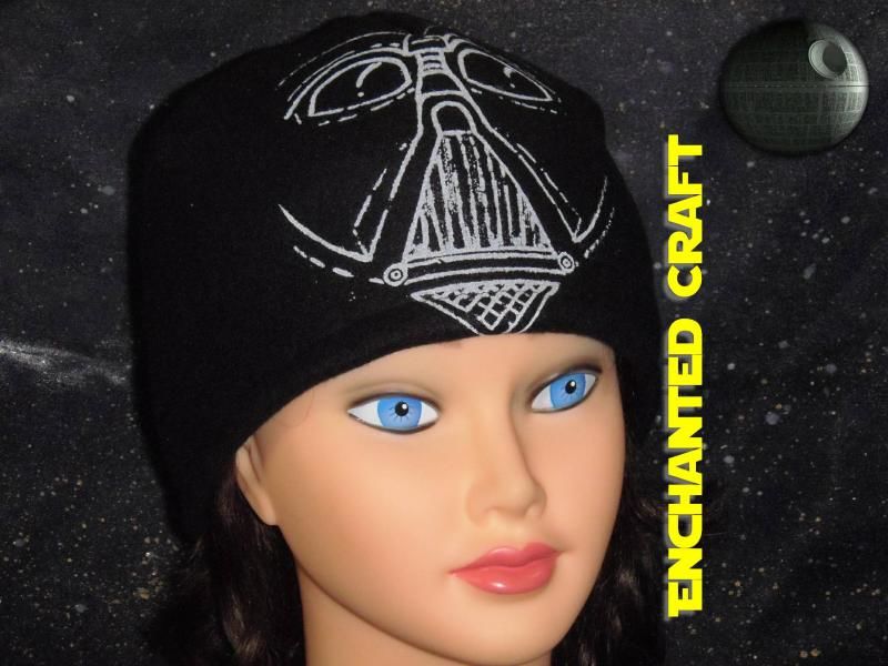 This warm and fun hat is made from black fleece hand printed with a hand designed DARTH VADER face. It is pieced together to form a nice rounded top and all the elements you would want to find on a DARTH VADER helmet!