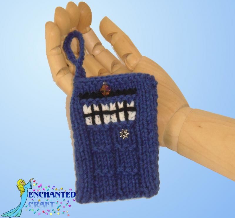 Created in beautiful blue yarn with a detailed Tardis worked right into the knitting. The Tardis has an AB golden celestial crystal light on top, and the iconic windows in white.
